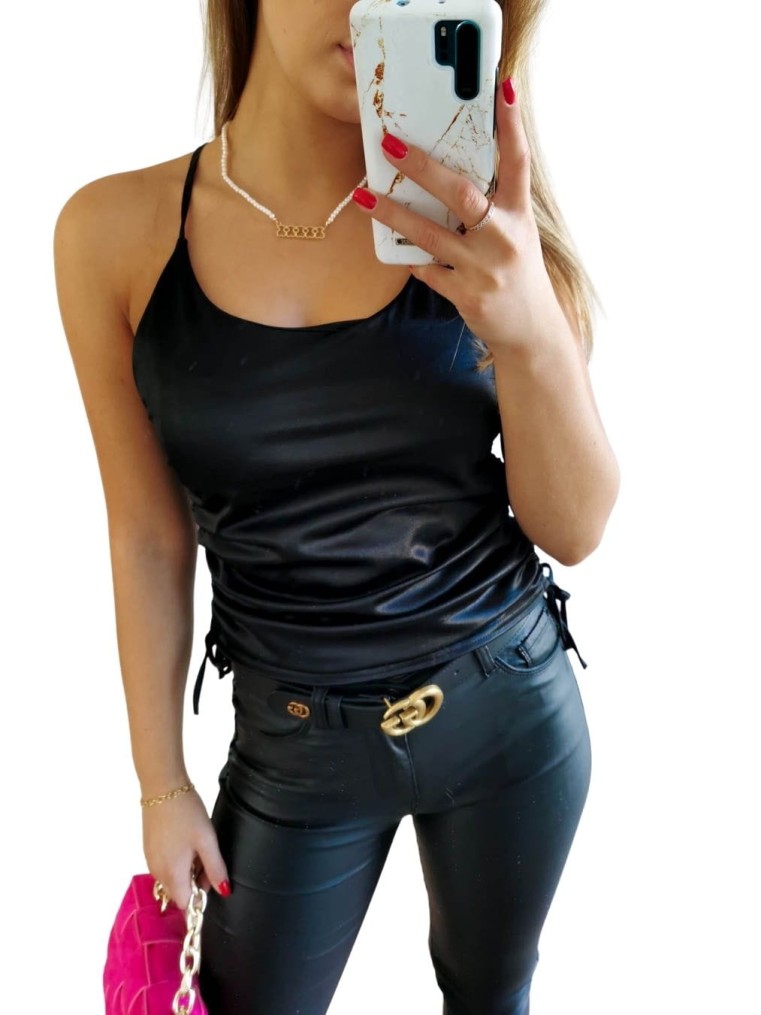 Bluzka atłasowa z marszczeniami z boku. Można regulować sobie długość. Miła w dotyku, piękny dekolt X z tyłu.