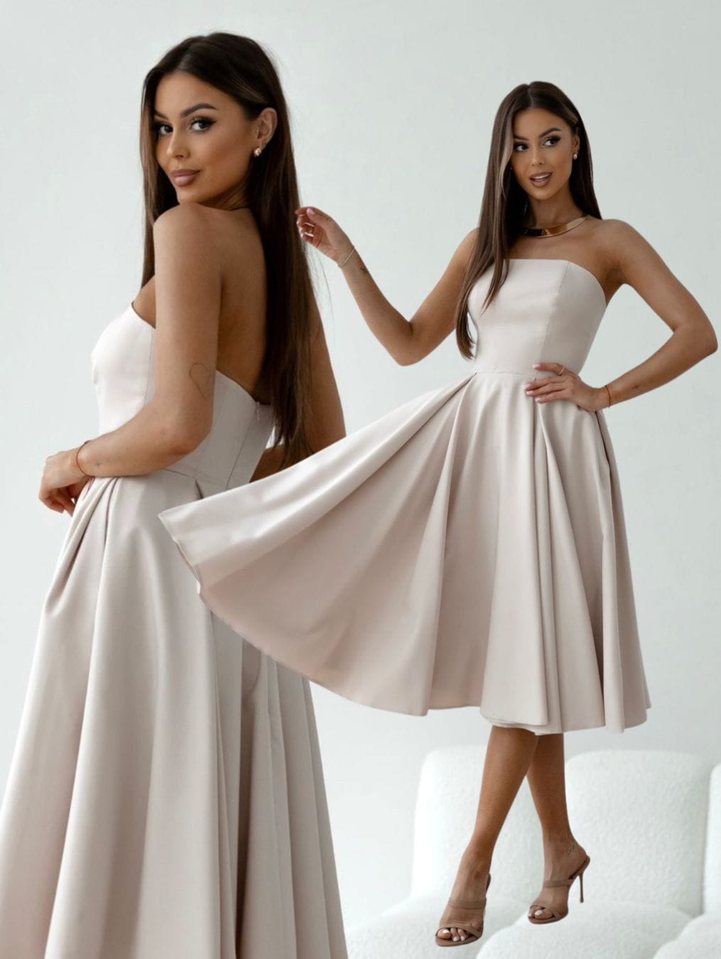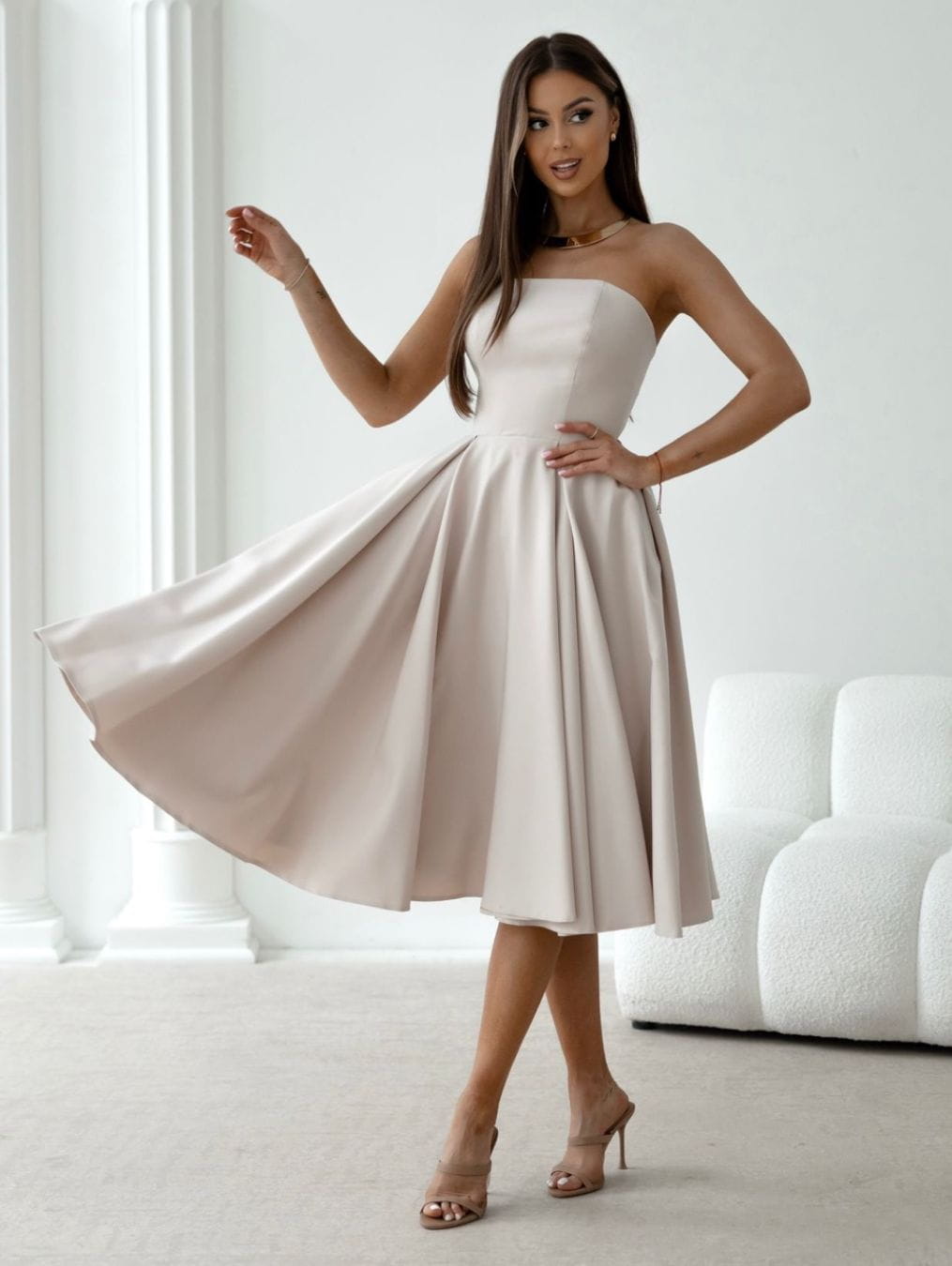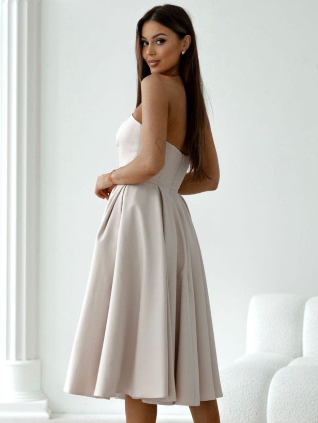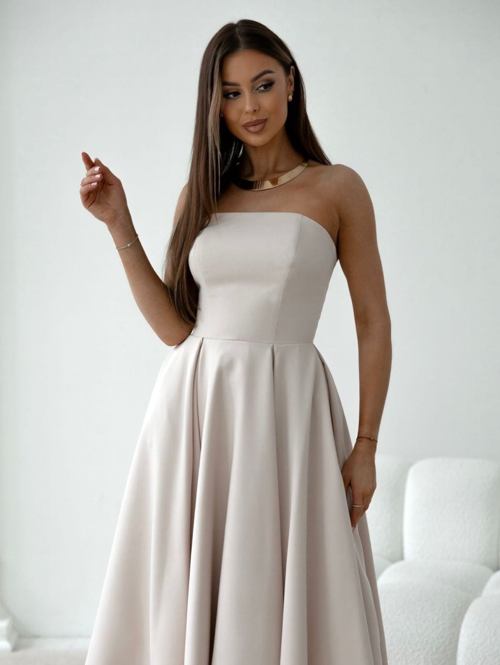 Sukienka idealna na wesele 2025, wykonana w pięknym odcieniu beżu