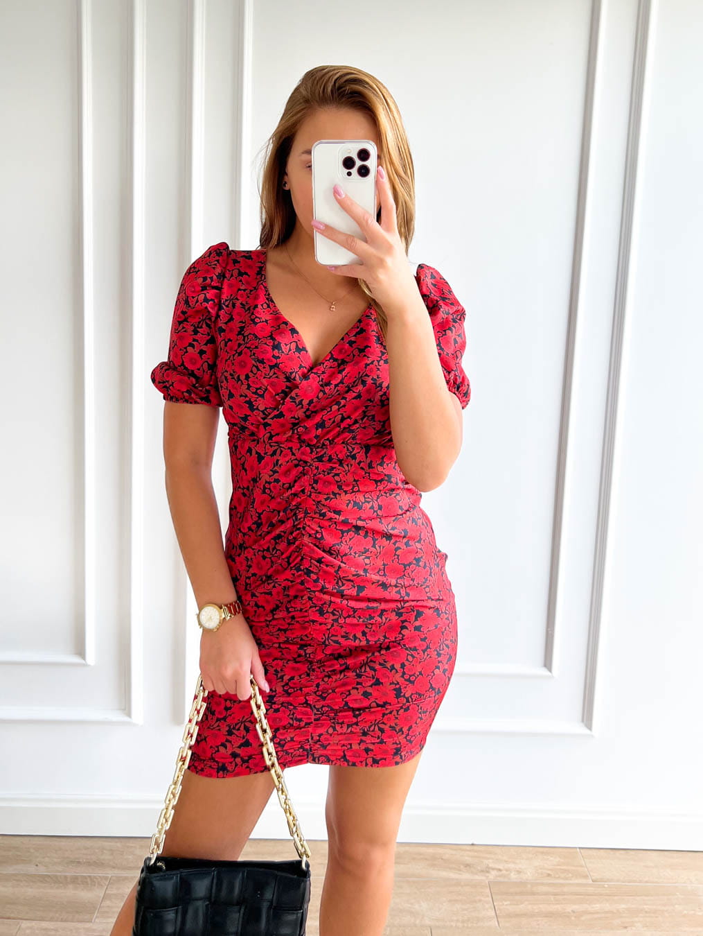 Elie polska sukienka marszczona czarna w czerwone kwiatki