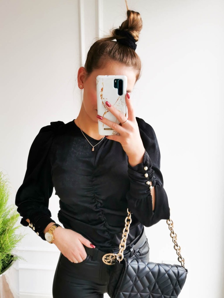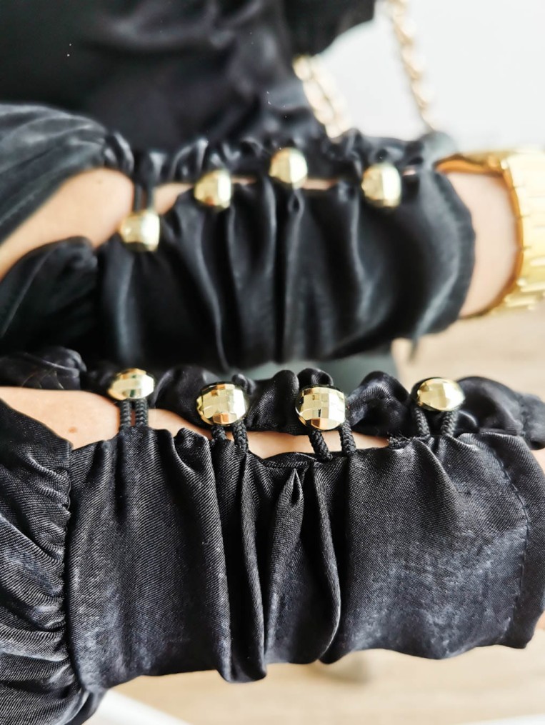 Bluzka na długi rękaw marszczona po całości. Rękawki również posiadają delikatne marszczenia i guziczki w kolorze złota. Bluzka zapinana na guzik z tyłu i zamek z boku. Przyjemny w dotyku materiał, delikatnie w połysku, nie ciągnie się. Polska produkcja.