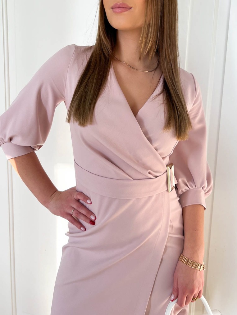 Julia sukienka z klamrą pudrowy róż elegancka z 3/4 rękawem