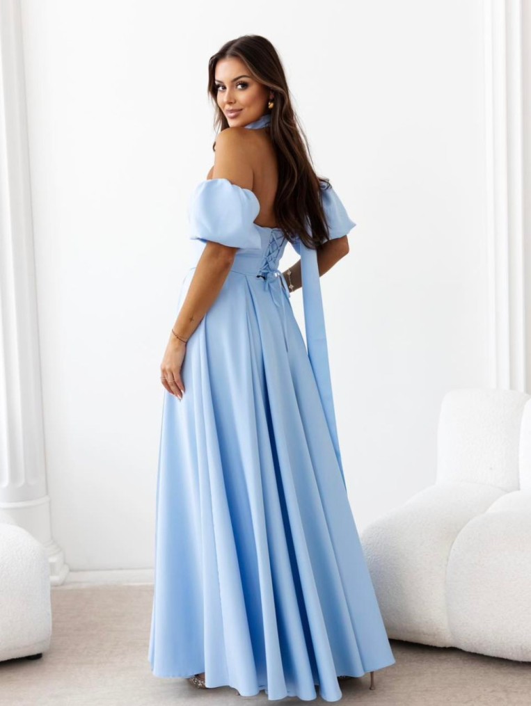 Kiara błękitna rozkloszowana sukienka maxi z szalem i bufkami