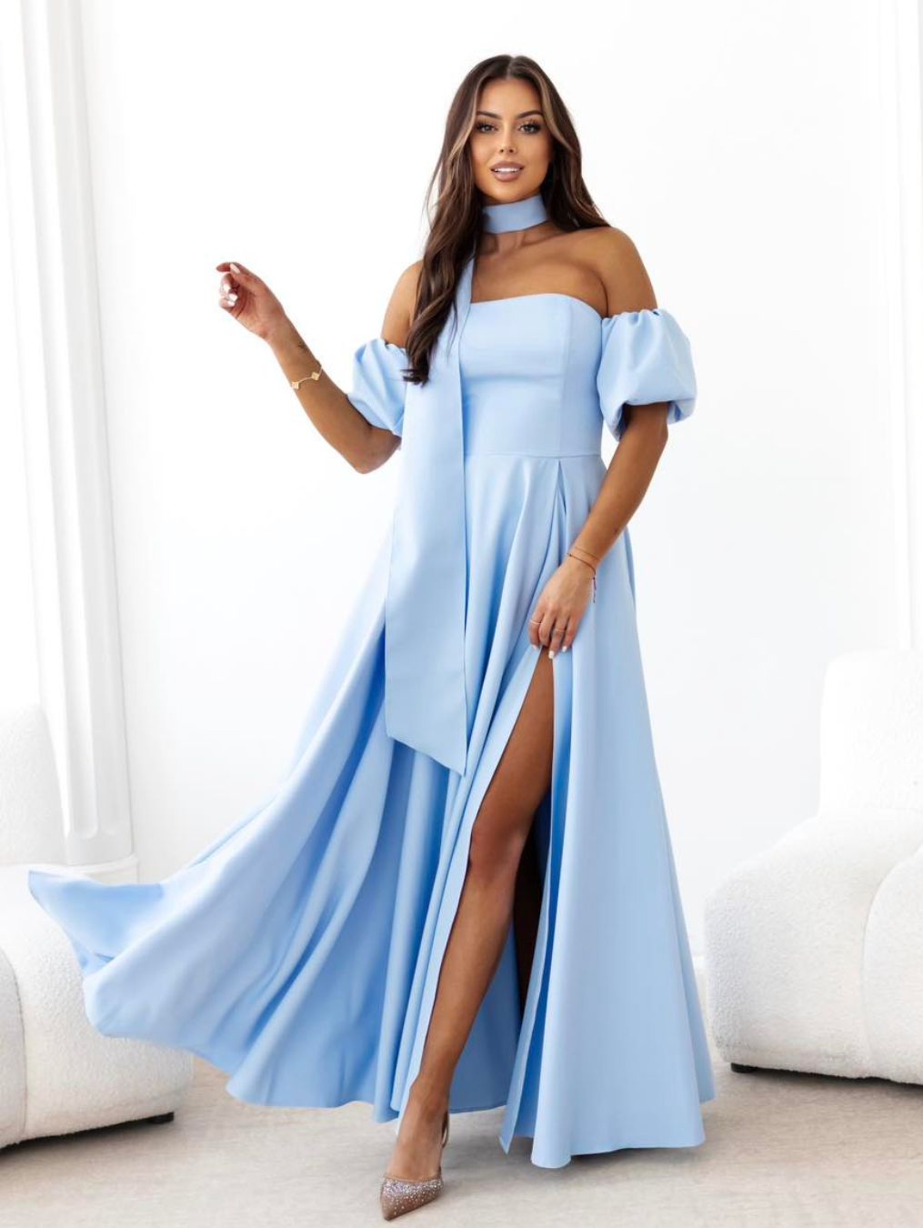 Kiara to elegancka, błękitna, długa sukienka z odpinanymi rękawkami i efektownym szalem.
