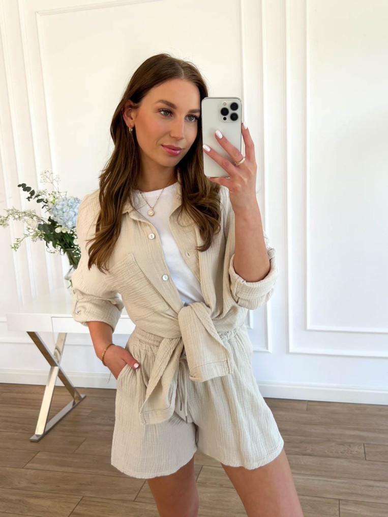 Komplet malaga muślinowy beżowy letni koszula+spodenki 100% bawełna