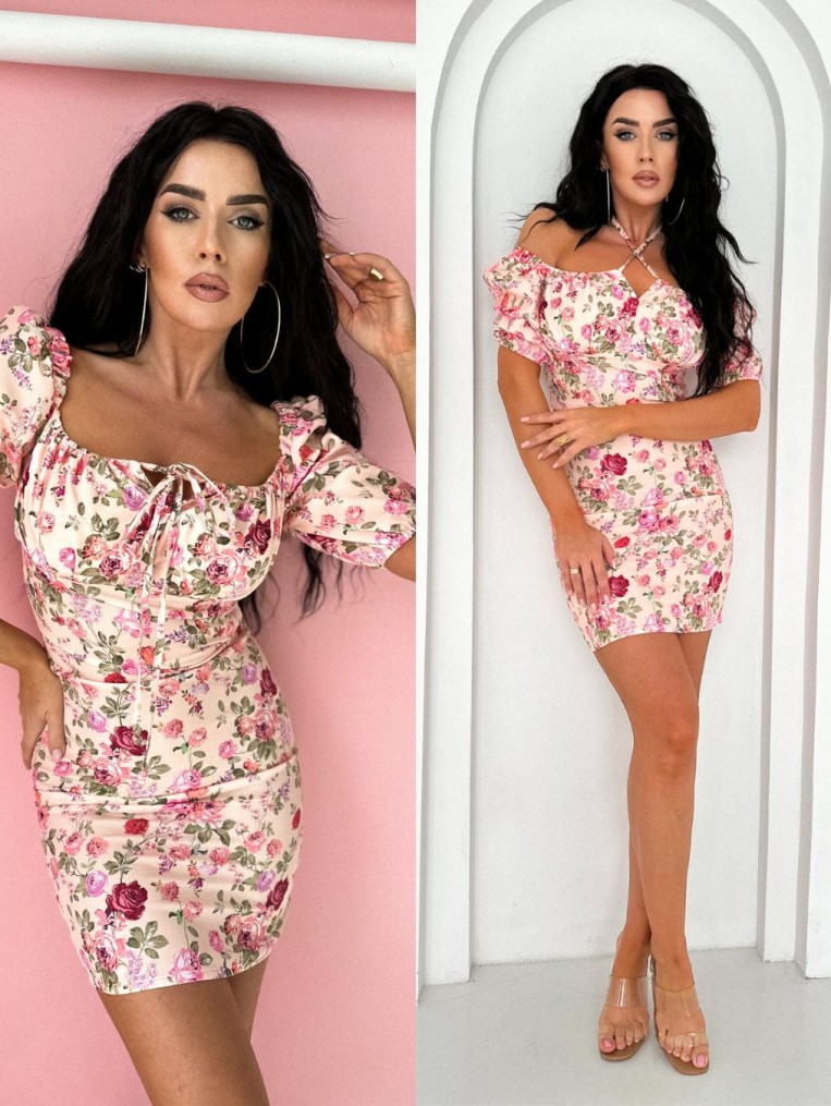 Sukienka mini z krótkim rękawem w piękny kwiatowy wzór.