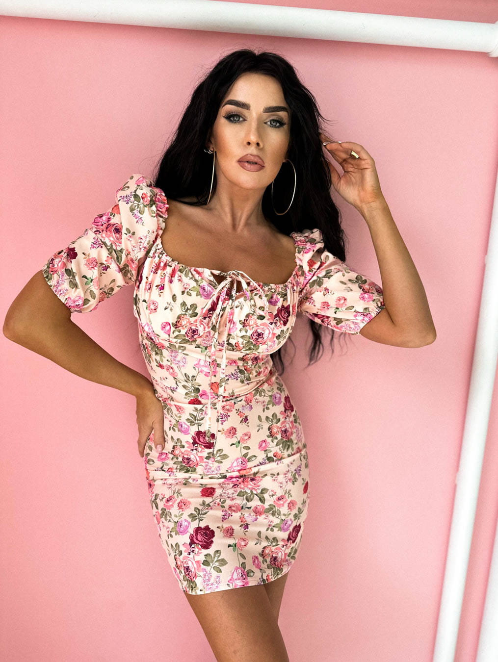 Lasal sukienka beżowa w kwiaty mini dopasowana z marszczonym dekoltem