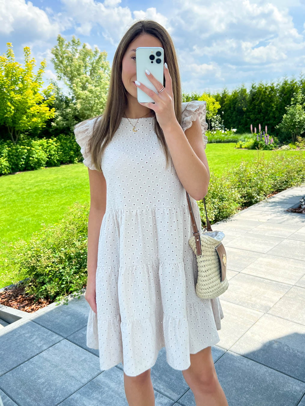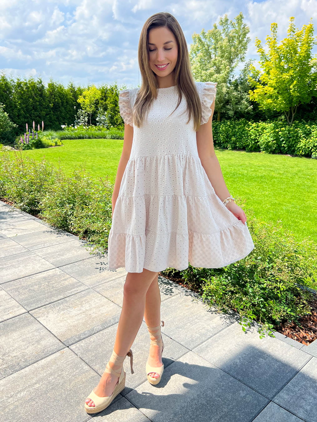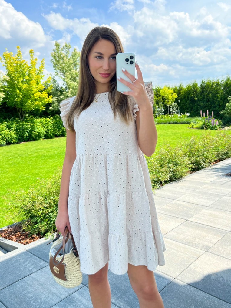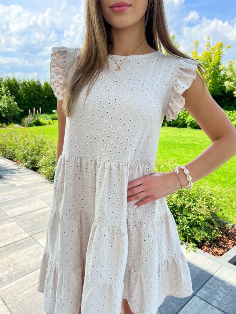 Muślinowa beżowa letnia sukienka ażurowa na krótki rękaw sun