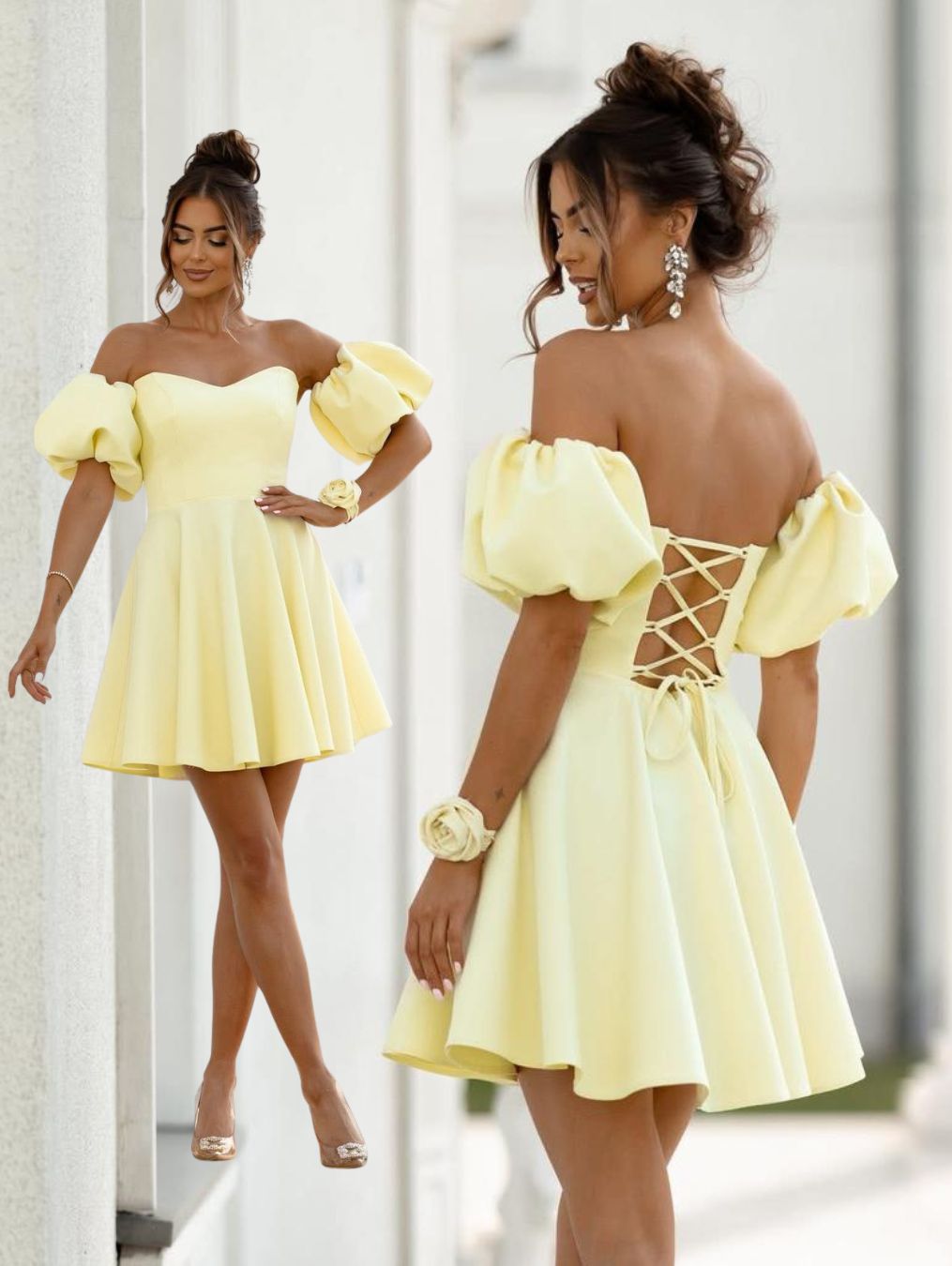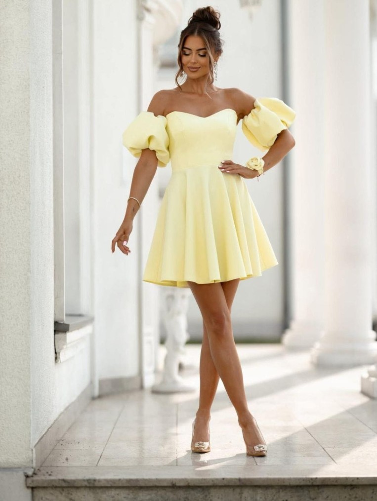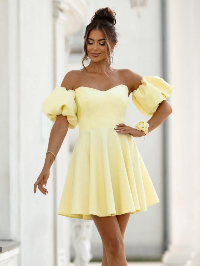 Sukienka Olivia w cytrynowym kolorze to idealny model krótkiej sukienki na wesele w modnym żółtym kolorze w odcieniu cytryny.