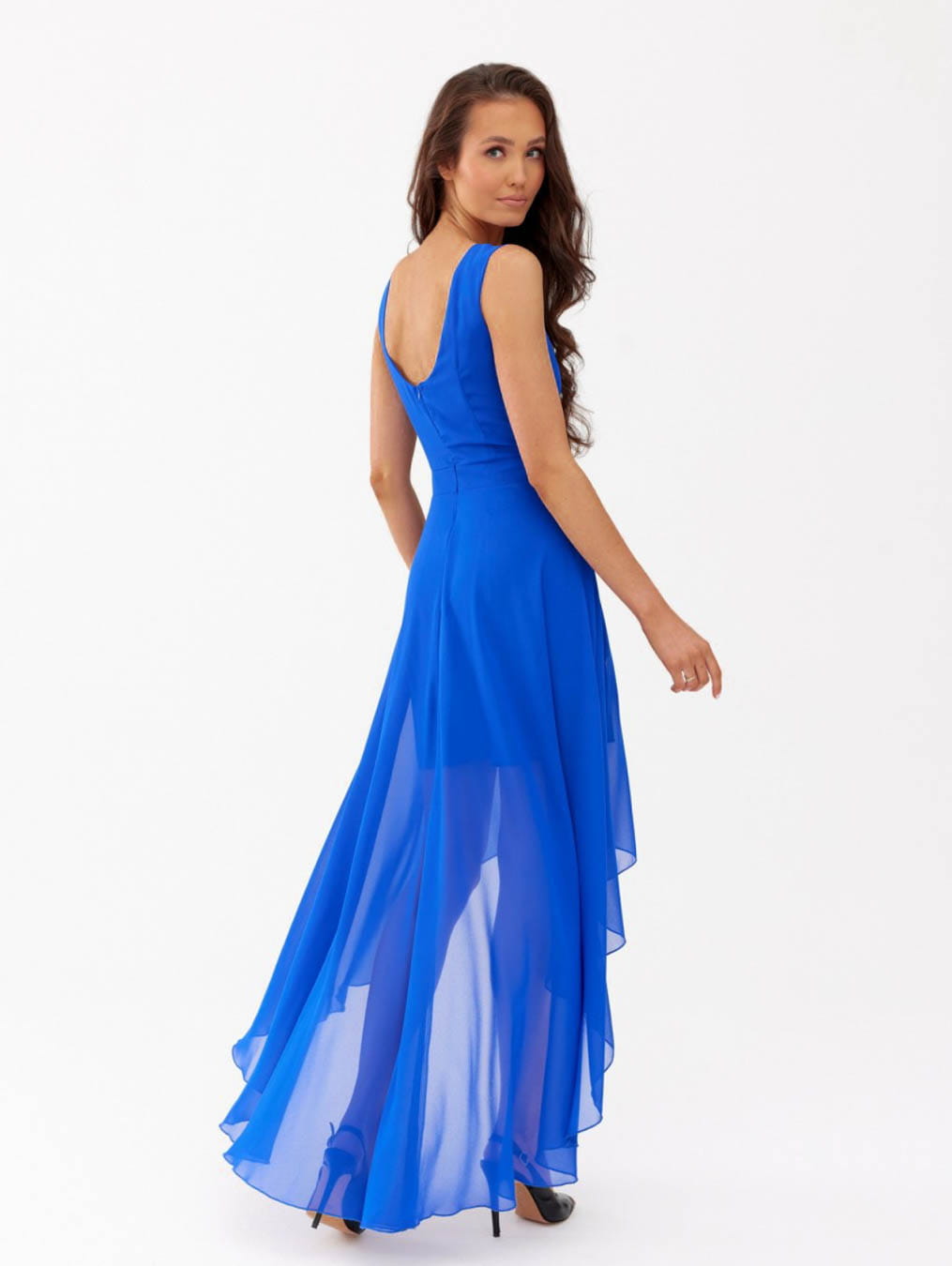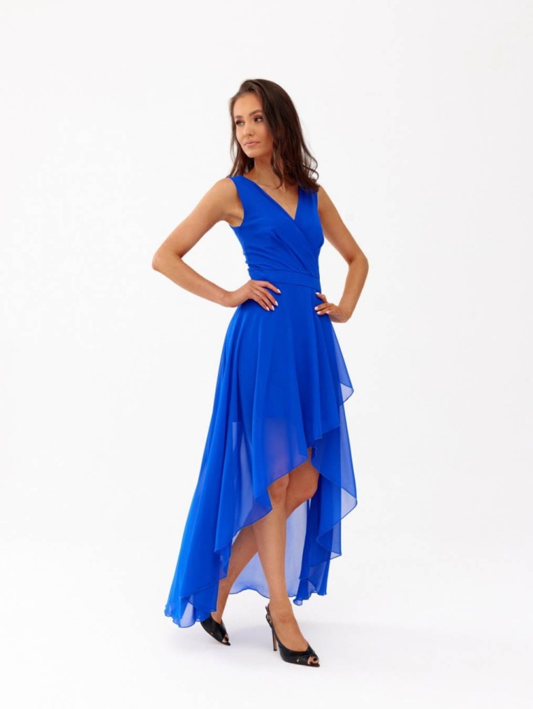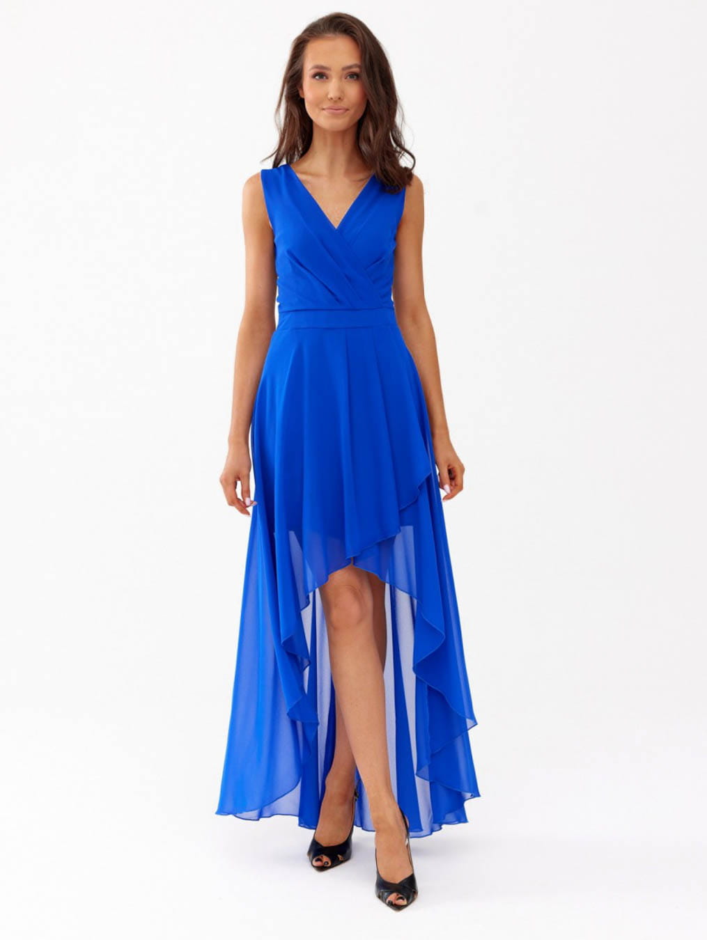 Sukienka asymetryczna chabrowa niebieska maxi z krótszym przodem na szerokich ramiączkach kopertowy dekolt cyntia