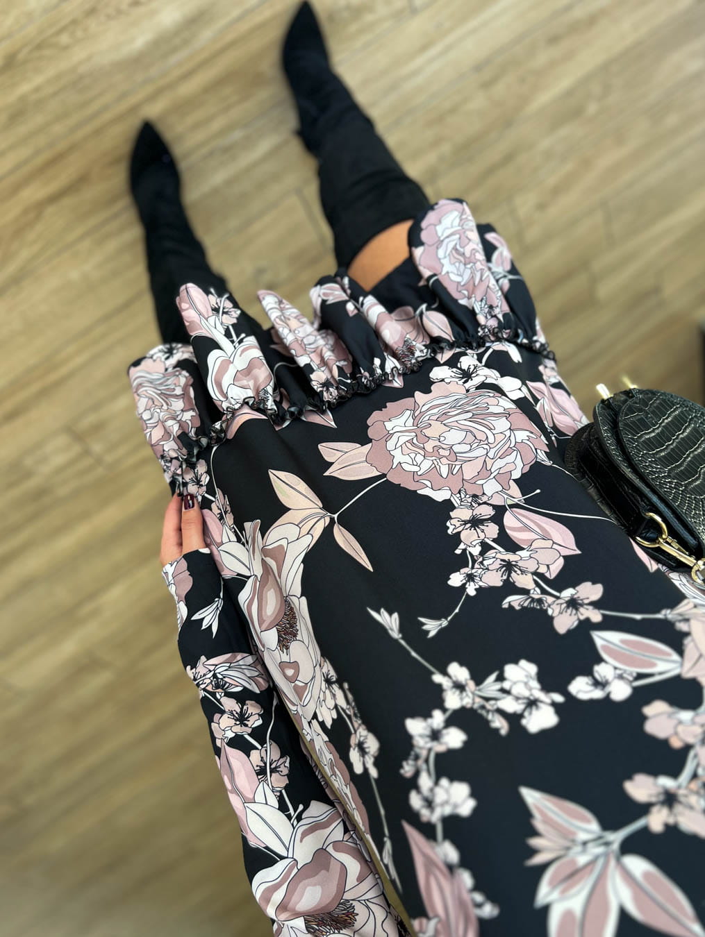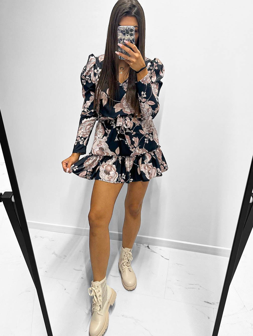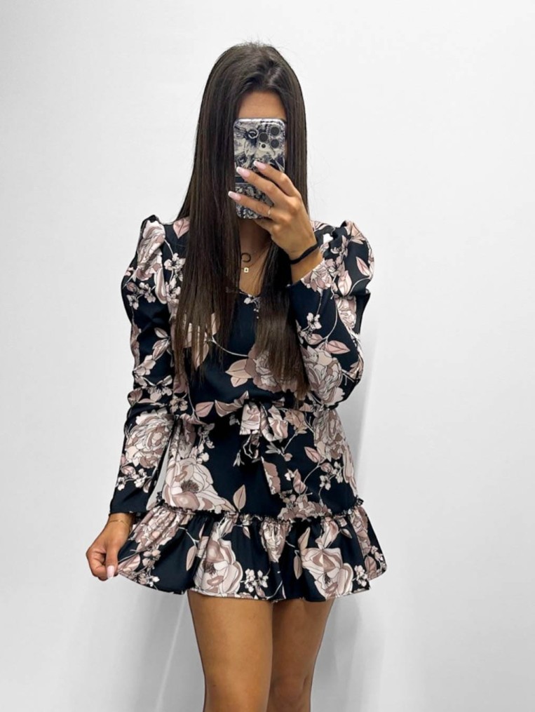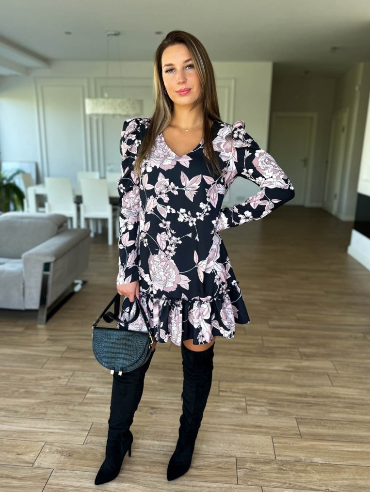 Sukienka czarna w beżowe kwiaty camilla z falbanką długi rękaw