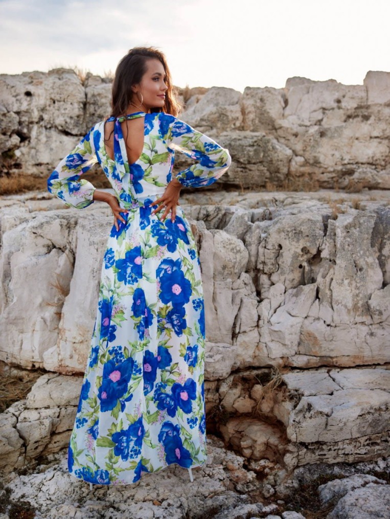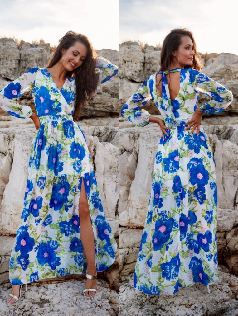 Sukienka szyfonowa biała w niebieskie kwiaty maxi z rozcięciem na nodze na długi rękaw z wiązaniem na plecach choix2