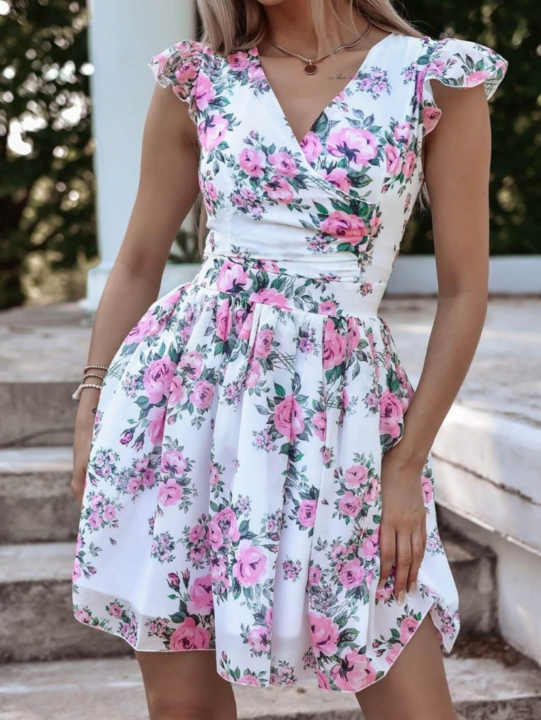 Sukienka szyfonowa biała w różowe kwiaty z zielonym delikatny rękaw rozkloszowana sierra